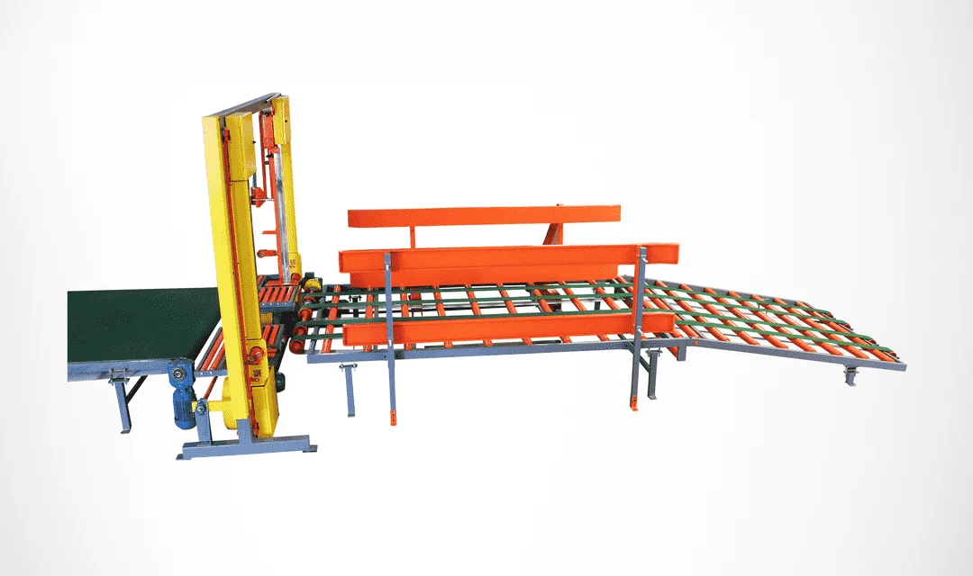 Máquina para refilar (limpar) as cascas laterais dos blocos de espuma. A esteira possui uma rampa para a entrada do bloco. A regulagem do encosto do bloco e do cabeçote da lâmina de corte são motorizados e são acionados por painel de controle.